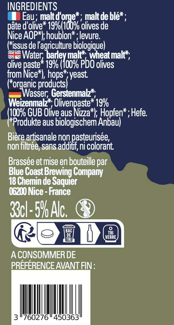 Es ist das Ergebnis einer Zusammenarbeit mit der Brauerei Blue Coast in Nizza. Sein Geheimnis liegt in der Verwendung einer einzigartigen Olivensorte, natürlich aus Nizza, die zu einer Paste verarbeitet wird, um die Freisetzung aller Aromen zu fördern. Die Magie und das Know-how des Braumeisters haben den Rest erledigt.