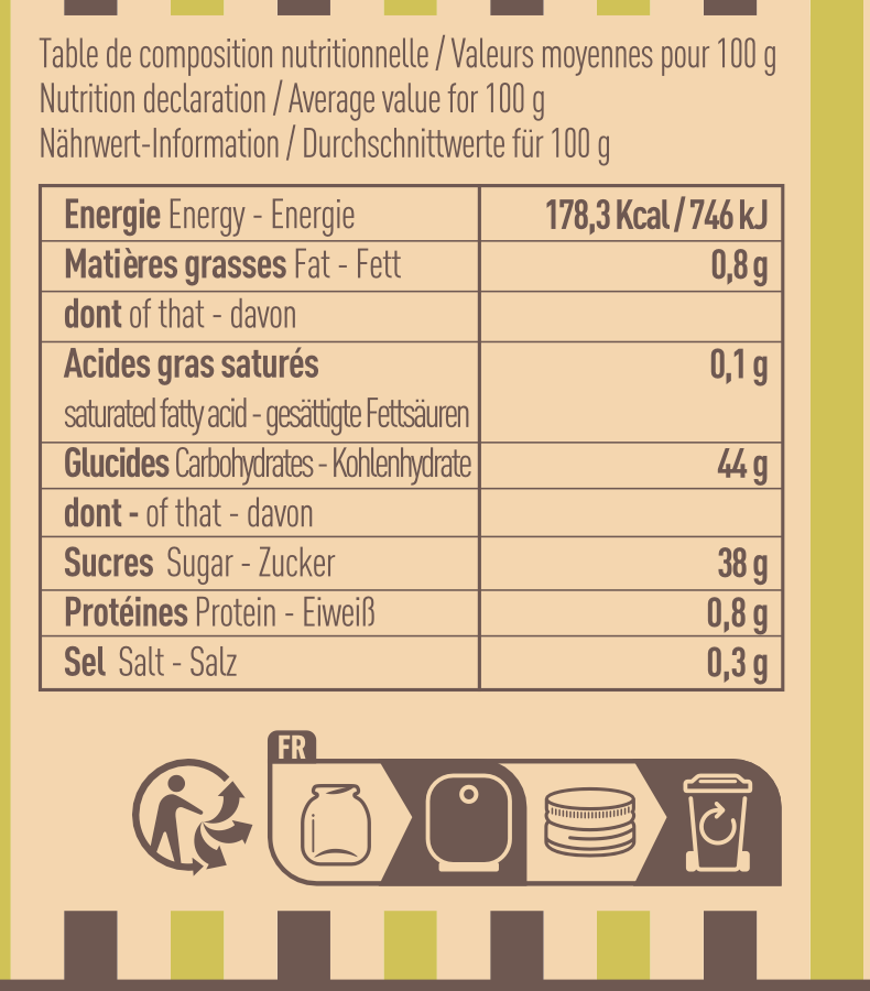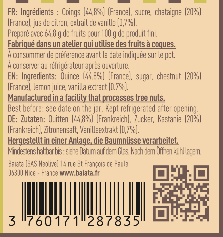 Quitten (44,8 %) (Frankreich), Zucker, Kastanien ( 20 %) (Frankreich), Zitronensaft, Vanilleextrakt (0,7 %). Hergestellt aus 64,8 Gramm Früchten pro 100 Gramm Endprodukt.
