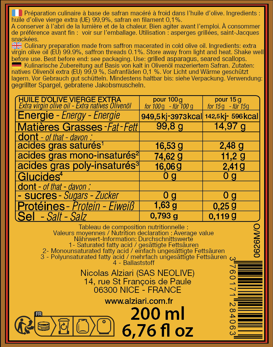 200 ml natives Olivenöl extra, 0,5 g Safran.