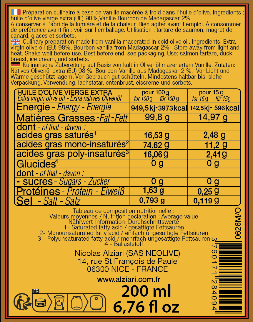 98% Olivenöl extra vergine, Vanillebohne